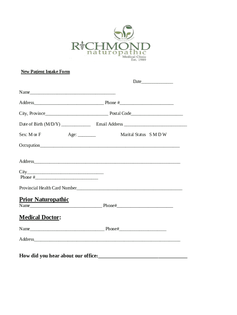 New Patient Intake Form Date Name Address Phone # City, Province Postal Code Date of Birth (M/D/Y) Sex: M or Email Address Age: Marital Status S M DW Occupation Address City Phone # Provincial Health