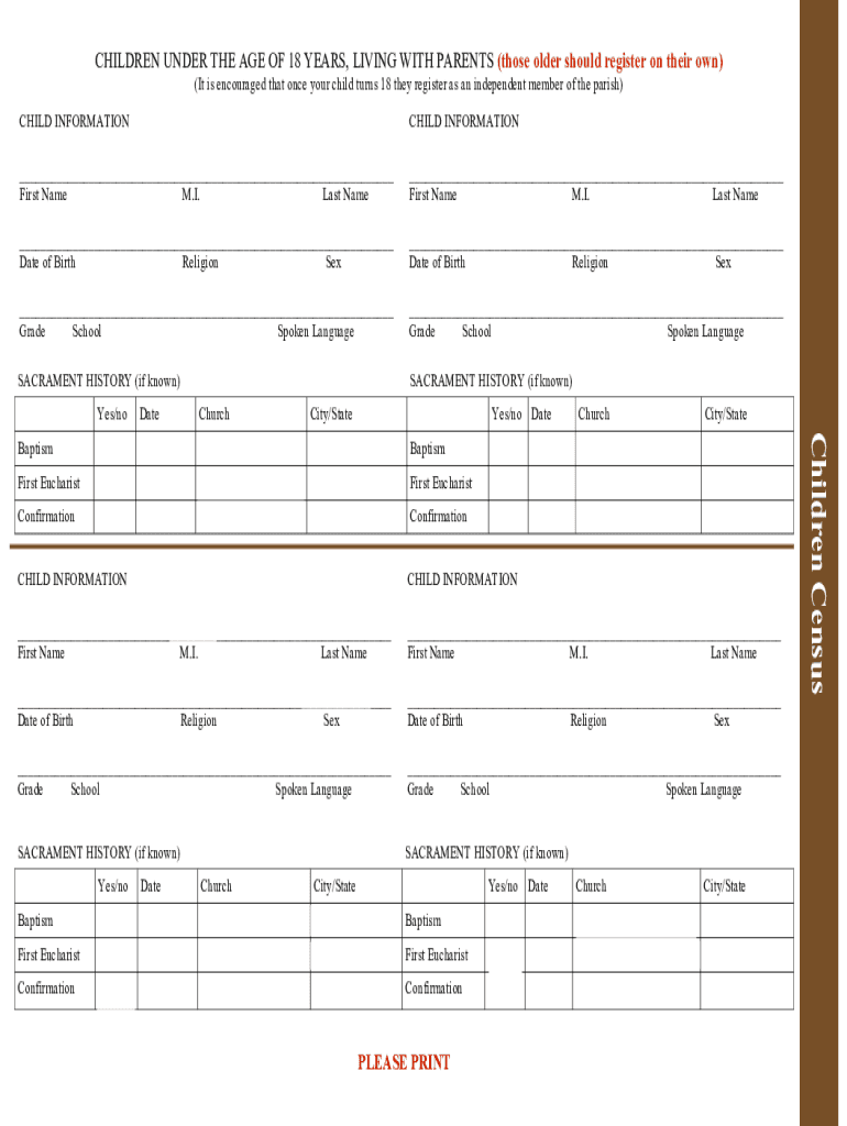 CHILDREN UNDER THE AGE OF 18 YEARS, LIVING WITH PARENTS (those older should register on their own) (It is encouraged that once your child turns 18 they register as an independent member of the parish)