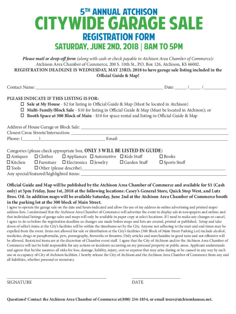 5th ANNUAL ATCHISONCITYWIDE Garage Sale Registration Form Saturday, JUNE 2nd, 2018 8am to 5pm Please mail or drop-off form (along with cash or check payable to Atchison Area Chamber of Commerce):