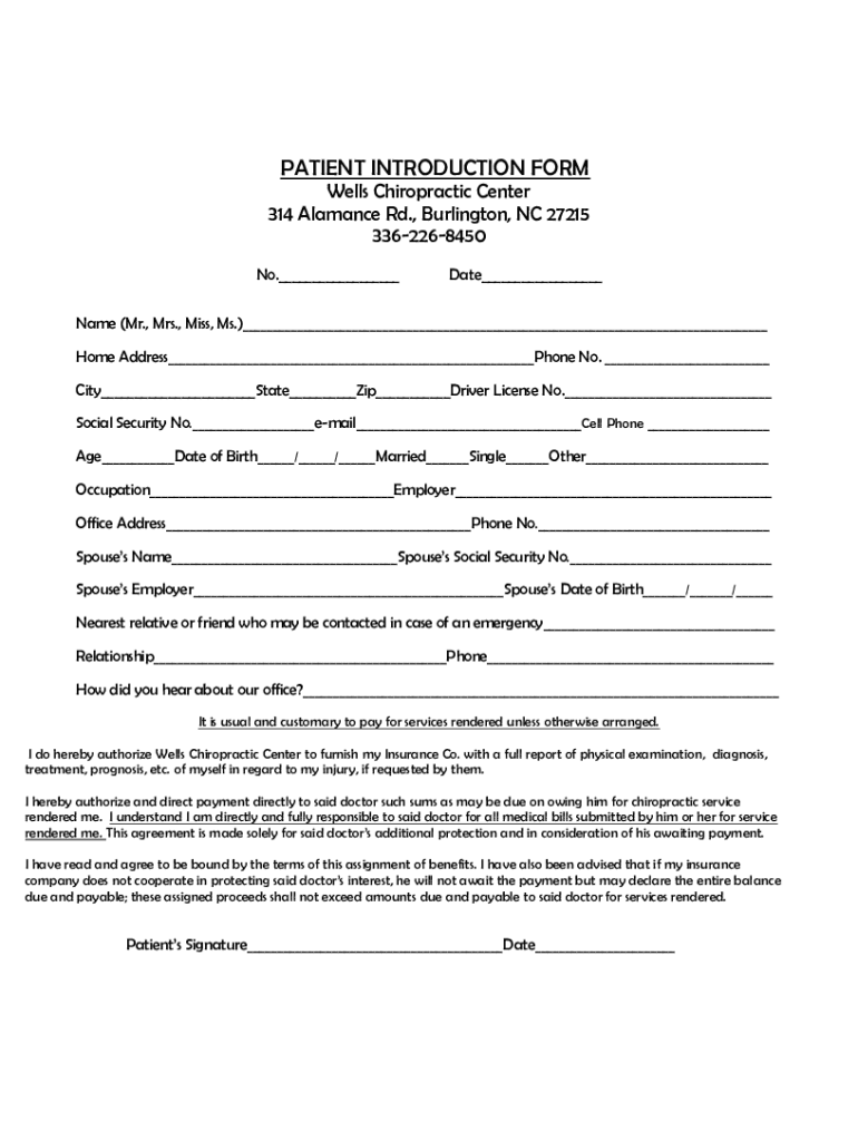 PATIENT INTRODUCTION FORM Wells Chiropractic Center 314 Alliance Rd., Burlington, NC 27215 3362268450 No. Date Name (Mr., Mrs., Miss, Ms.) Home Address Phone No. City State Zip Driver License No.