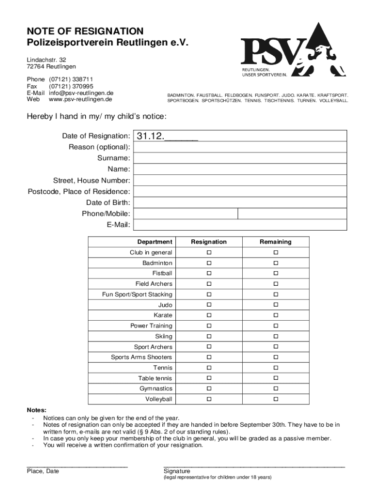NOTE OF RESIGNATION Polizeisportverein Reutlingen e.V. Lindachstr. 32 72764 Reutlingen Phone Fax Email Web(07121) 338711 (07121) 370995 info Reutlingen.de www.psvreutlingen.deBADMINTON. FASTBALL.