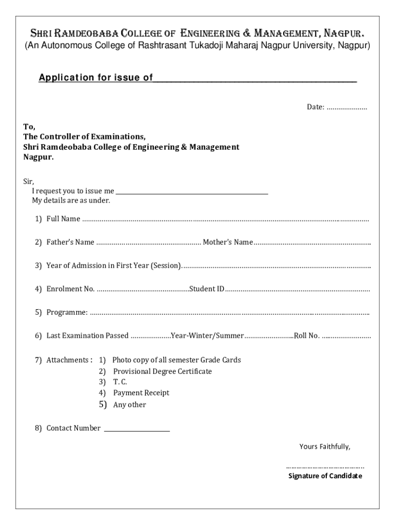 SARI RAMDEOBABA COLLEGE OF ENGINEERING & MANAGEMENT, NAGPUR. (An Autonomous College of Rashtrasant Tukadoji Sahara Nagpur University, Nagpur) Application for issue of To, The Controller of Examinations,