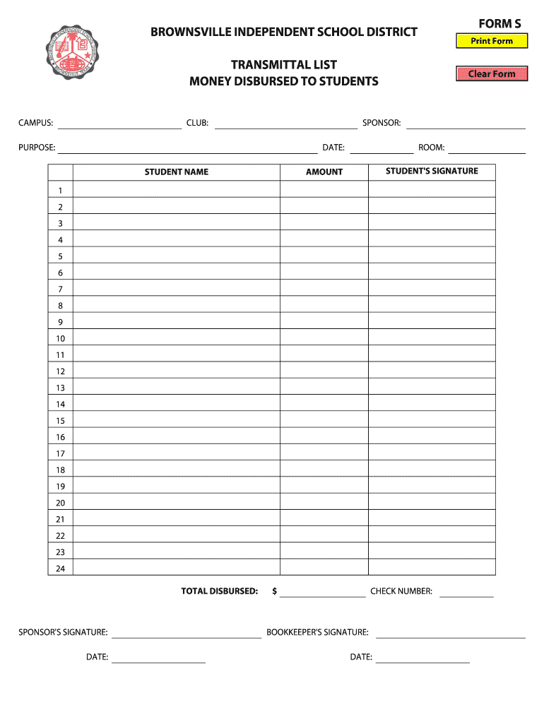 The Transmittal List for Student Disbursements is an education form used by the Brownsville Independent School District to track money disbursed to students.