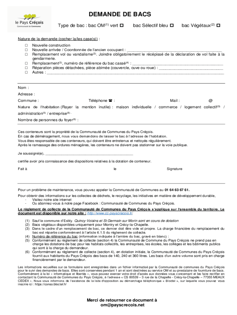 Joindre tout document exigé par l'organisme en charge de la demande de bacs de logement