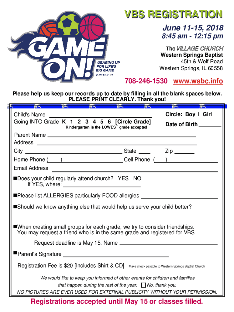 VBS REGISTRATION June 1115, 2018 8:45 am 12:15 pm The VILLAGE CHURCH Western Springs Baptist 45th & Wolf Road Western Springs, IL 605587082461530 www.wsbc.info Please help us keep our records up to