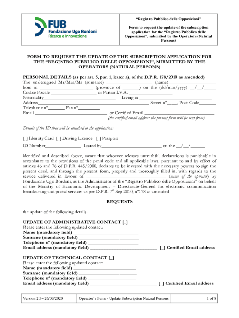 Registry Public Dell Opposition Form to request the update of the subscription application for the Registry Public Dell Opposition, submitted by the Operators (Natural Persons)FORM TO REQUEST THE