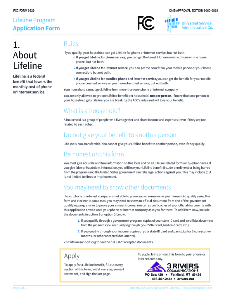 FCC FORM 5629OMB APPROVAL EDITION 30600819Lifeline Program Application Form1. About Lifeline is a federal benefit that lowers the monthly cost of phone or internet service. Rules If you qualify, your