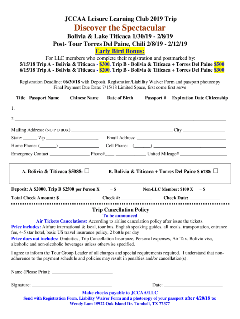 JC CAA Leisure Learning Club 2019 Rediscover the Spectacular Bolivia & Lake Titicaca 1/30/19 2/8/19 Post Tour Torres Del Paine, Chili 2/8/19 2/12/19 Early Bird Bonus: For LLC members who complete