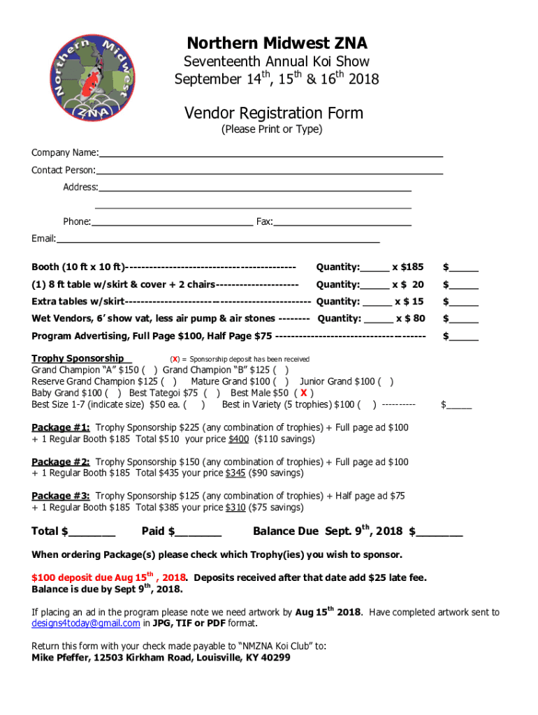 Northern Midwest RNA Seventeenth Annual KOI Show September 14th, 15th & 16th 2018Vendor Registration Form (Please Print or Type)Company Name: Contact Person: Address: Phone:Fax:Email: Booth (10 ft