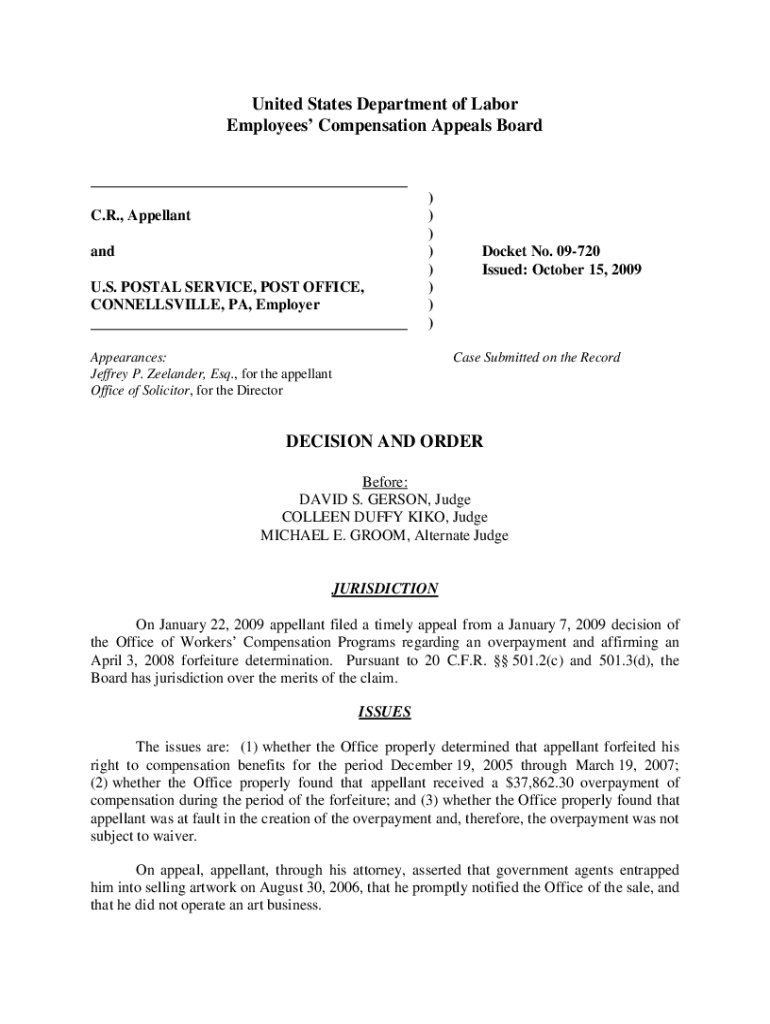 United States Department of Labor Employees Compensation Appeals Board C.R., Appellant and U.S. POSTAL SERVICE, POST OFFICE, CONNELLSVILLE, PA, Employer))))))))Appearances: Jeffrey P. Icelander, Esq.,