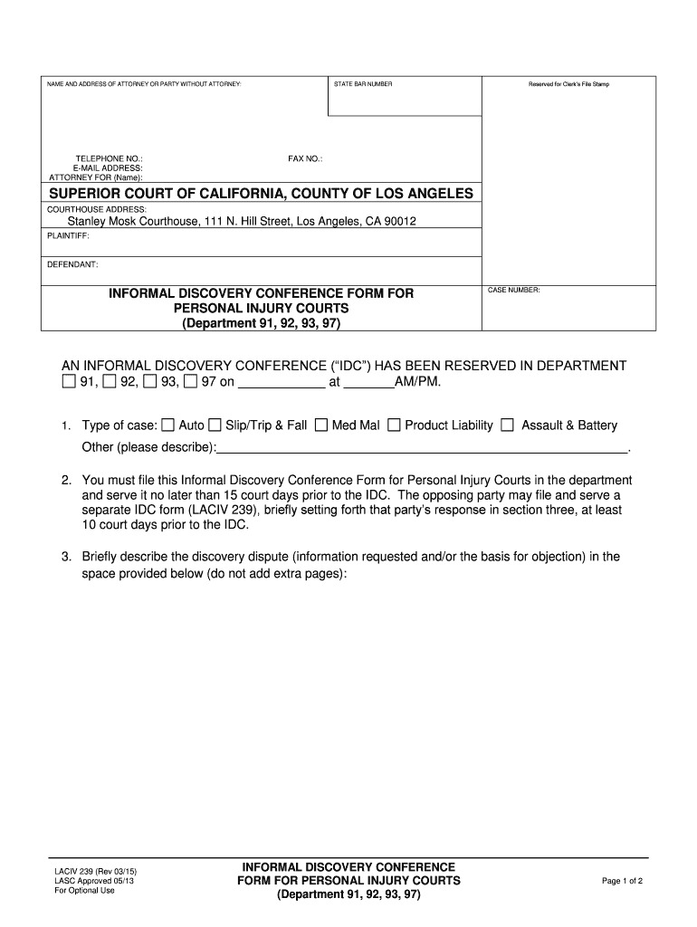 The California Informal Discovery Conference Form is a legal document used by parties in personal injury cases to resolve discovery disputes before a scheduled conference.