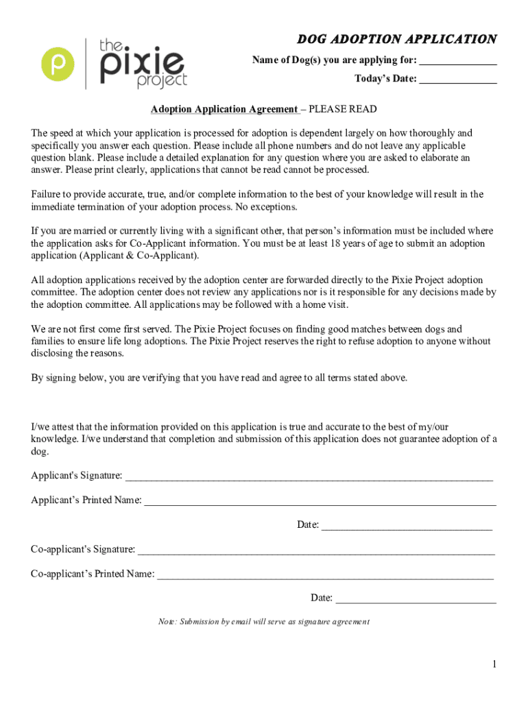 Applicants must meet specific eligibility criteria when filling out the Dog Adoption Application. Key requirements include being of legal age, having a suitable living situation, and possessing prior experience with pets. Additionally, the Pixie Project outlines certain adoption requirements that must be adhered to for approval.