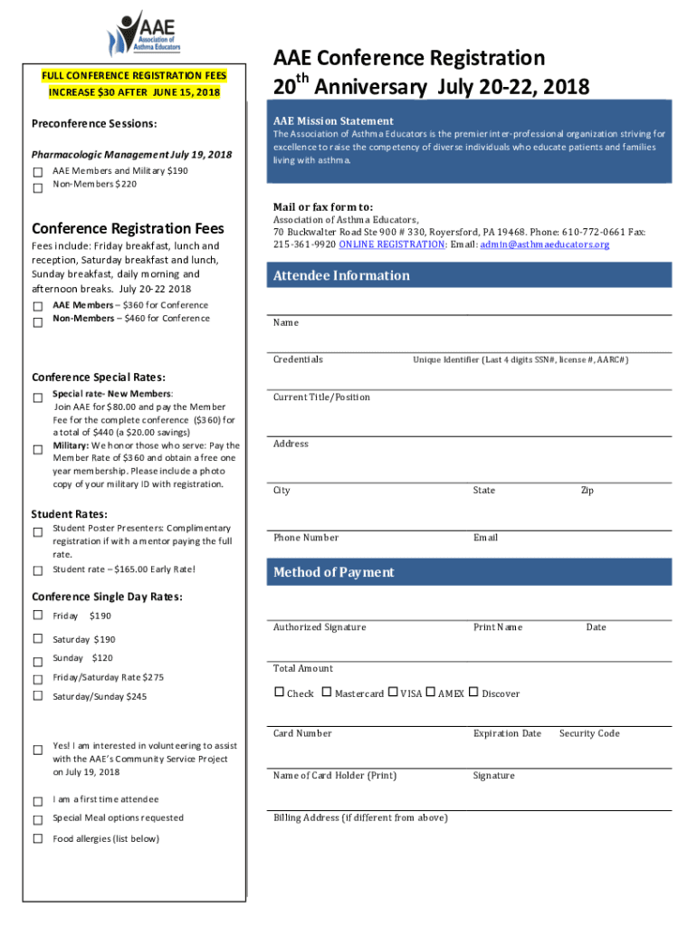 FULLCONFERENCEREGISTRATIONFEES INCREASE$30AFTERJUNE15,2018PreconferenceSessions:PharmacologicManagementJuly19,2018 AAEMembersandMilitary$190 NonMembers$220ConferenceRegistrationFees Fees include:Friday