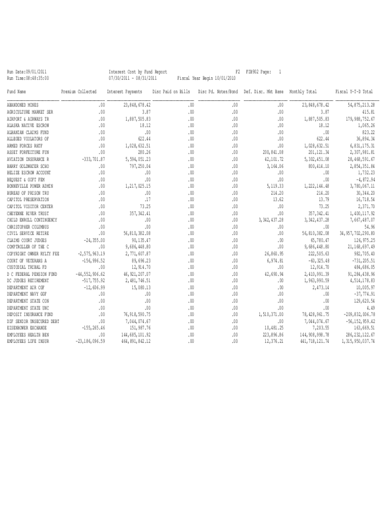 Run Date:09/01/2011 Run Time:08:48:35:00Interest Cost by Fund Report 07/30/2011 08/31/2011F2 Fiscal Year Begin 10/01/2010Fund Name Premium Collected Interest Payments Disc Paid on Bills ABANDONED