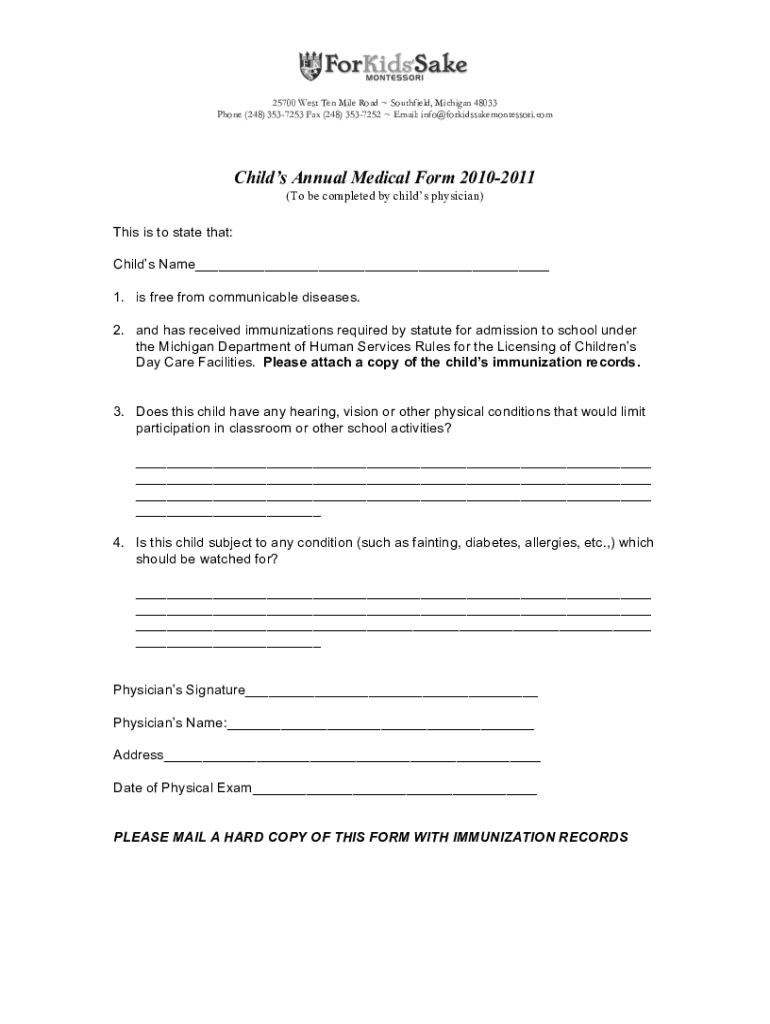 25700 West Ten Mile Road Southfield, Michigan 48033 Phone (248) 3537253 Fax (248) 3537252 Email: info forkidssakemontessori. Orchids Annual Medical Form 20102011 (To be completed by children physician)This