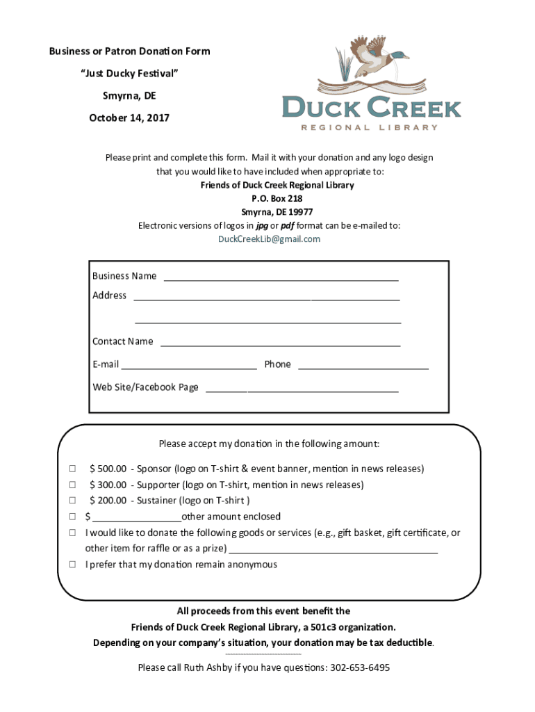 Business or Patron Donation Form Just Ducky Festival Smyrna, DE October 14, 2017, Please print and complete this form. Mail it with your donation and any logo design that you would like to have included
