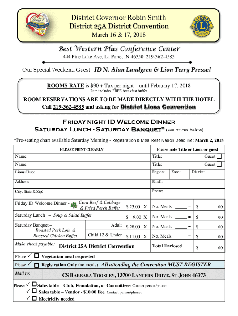 District Governor Robin Smith District 25A District Convention March 16 & 17, 2018 Best Western Plus Conference Center 444 Pine Lake Ave, La Port, IN 46350 2193624585Our Special Weekend Guest ID N.