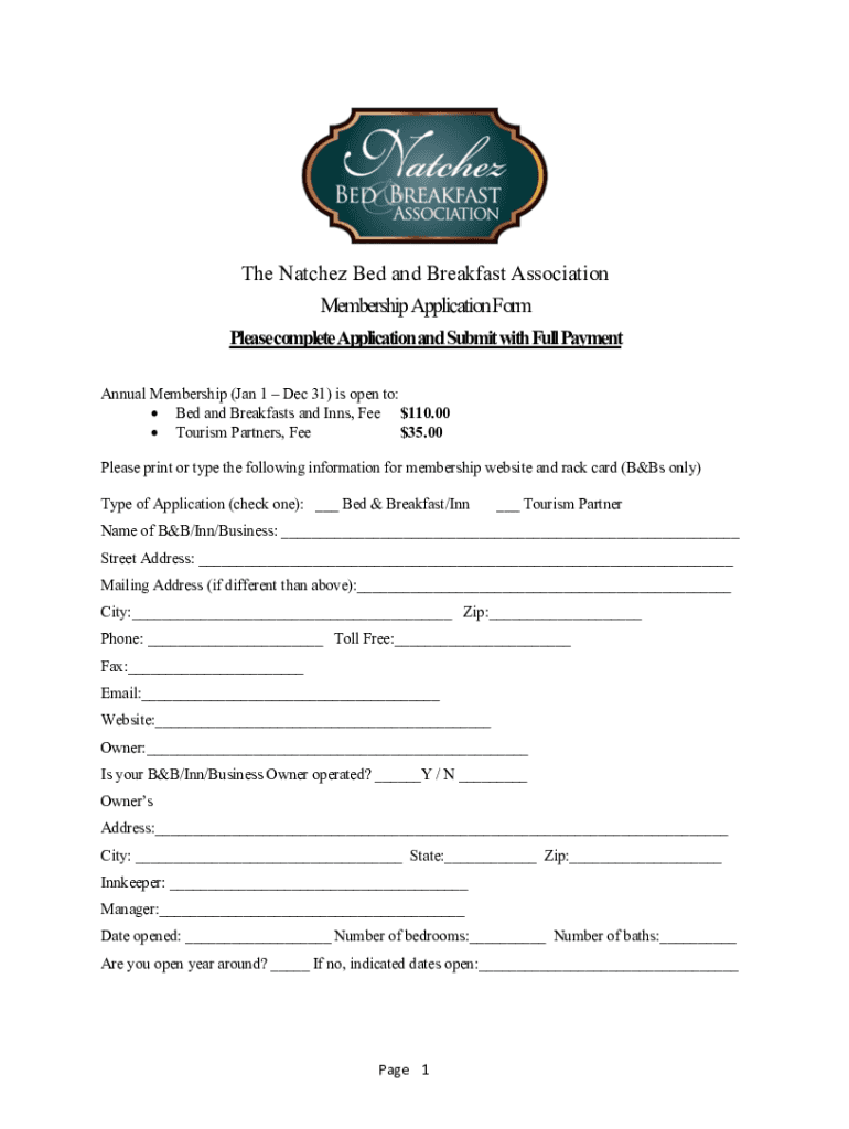 The Natchez Bed and Breakfast Association Membership Application Form Please complete Application and Submit with Full Payment Annual Membership (Jan 1 Dec 31) is open to: Bed and Breakfasts and Inns,