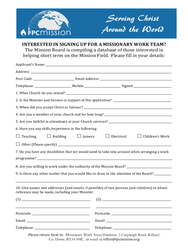 INTERESTEDINSIGNINGUPFORAMISSIONARYWORKTEAM? TheMissionBoardiscompilingadatabaseofthoseinterestedin helpingshorttermontheMissionField. Pleasefillinyourdetails: ApplicantsName: Address: Postcode: Misaddress:
