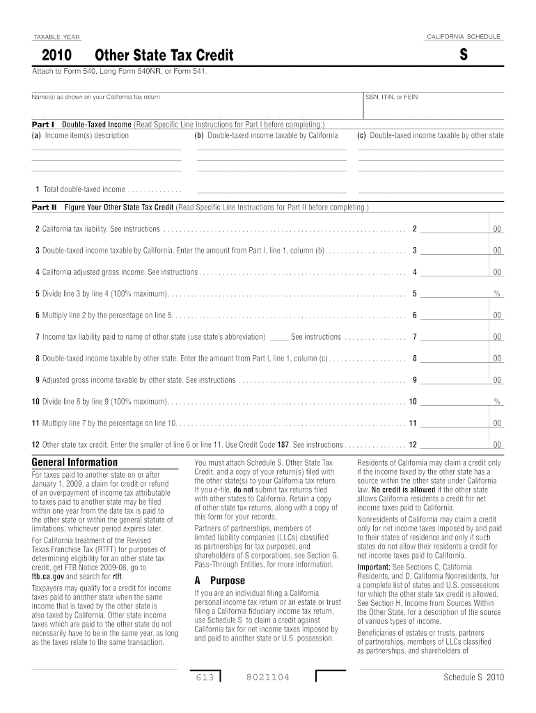 CALIFORNIA SCHEDULE TAXABLE YEAR 2010 S Other State Tax Credit Attach to Form 540, Long Form 540NR, or Form 541. Name(s) as shown on your California tax return SSN, ITIN, or VEIN Part I Double Taxed