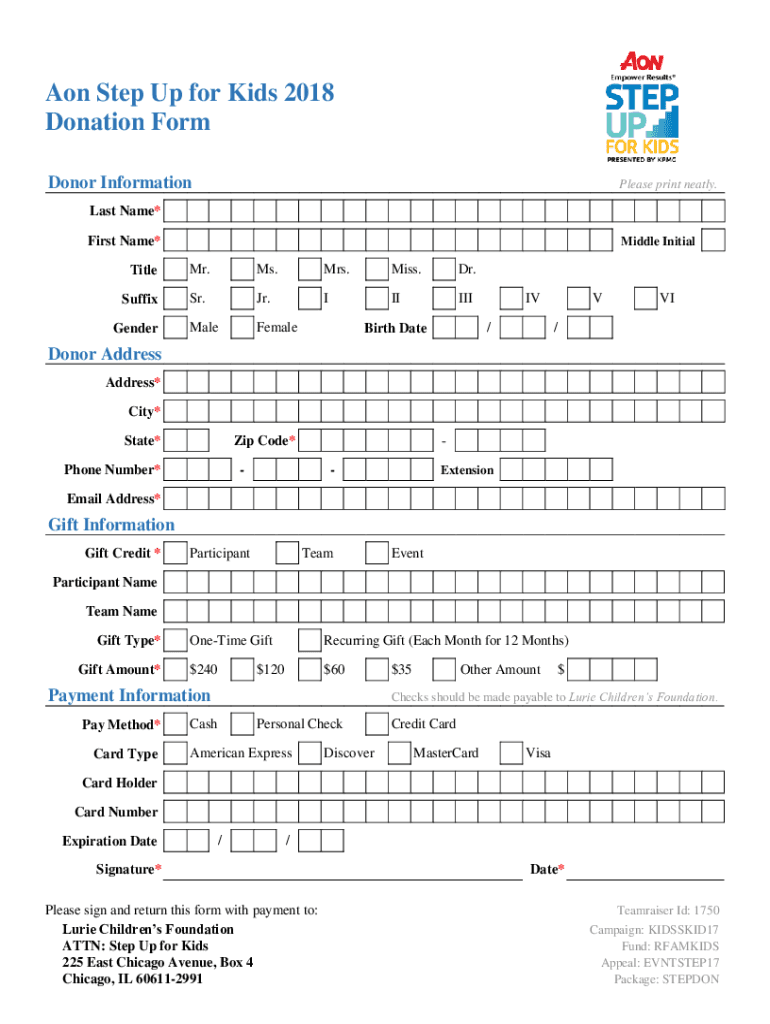 Get the free Aon Step Up for Kids 2018 Donation Form - Lurie Children's ... - foundation luriechi...