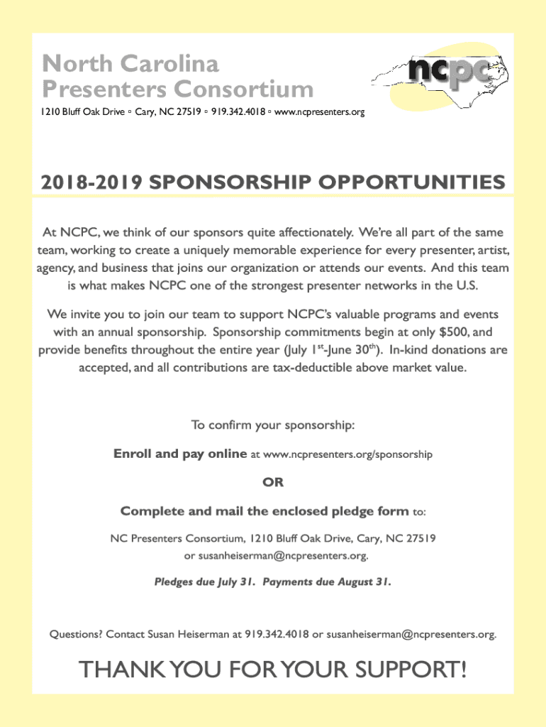 North Carolina Presenters Consortium 1210 Bluff Oak Drive Cary, NC 27519 919.342.4018 www.ncpresenters.orgNorth Carolina Presenters Consortium 1210 Bluff Oak Drive Cary, NC 27519 919.342.4018 www.ncpresenters.orgDIRECTORS