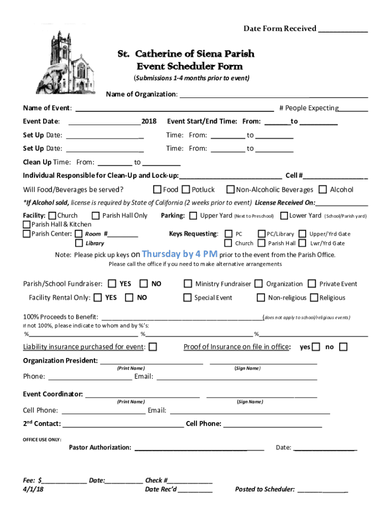 Date Form Received St. Catherine of Saint Parish Event Scheduler Form (Submissions 14 months prior to event)Name of Organization: Name of Event: # People Expecting Event Date: 2018Event Start/End
