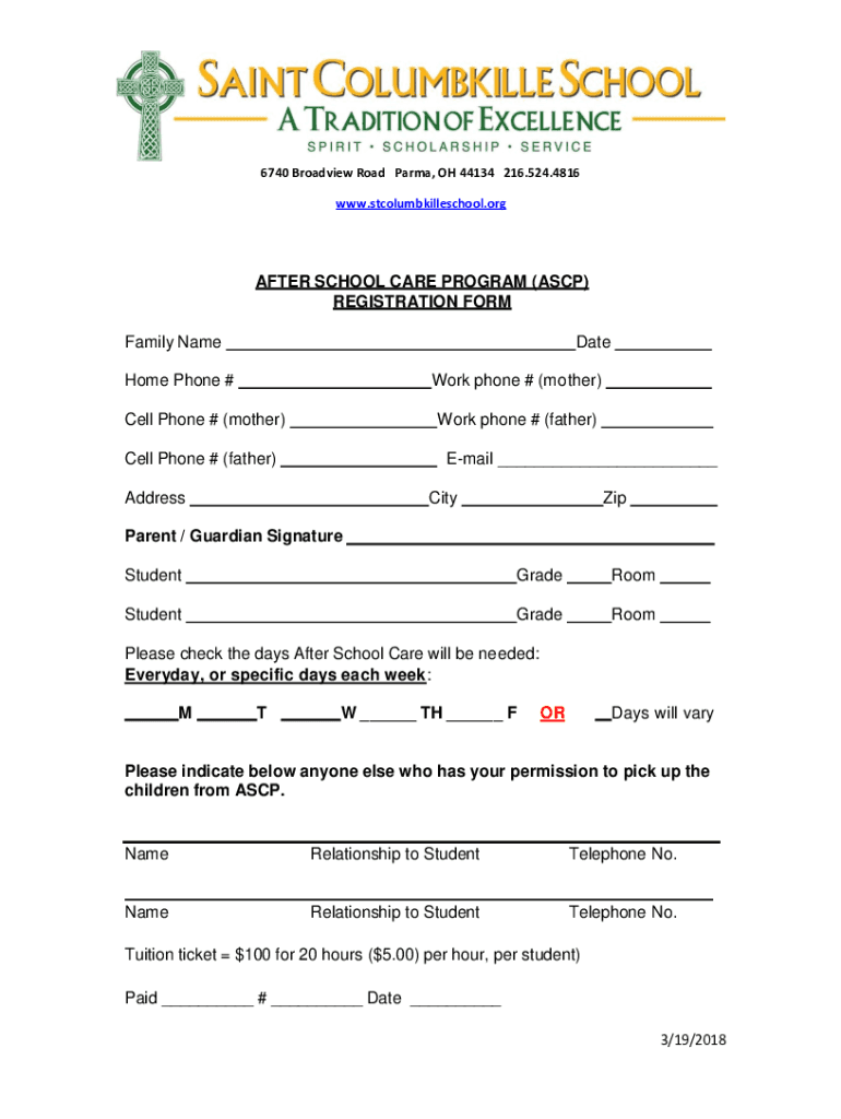 6740 Broadview Road Parma, OH 44134 216.524.4816 www.stcolumbkilleschool.orgAFTER SCHOOL CARE PROGRAM (ASAP) REGISTRATION FORM Family NameDateHome Phone #Work phone # (mother)Cell Phone # (mother)Work