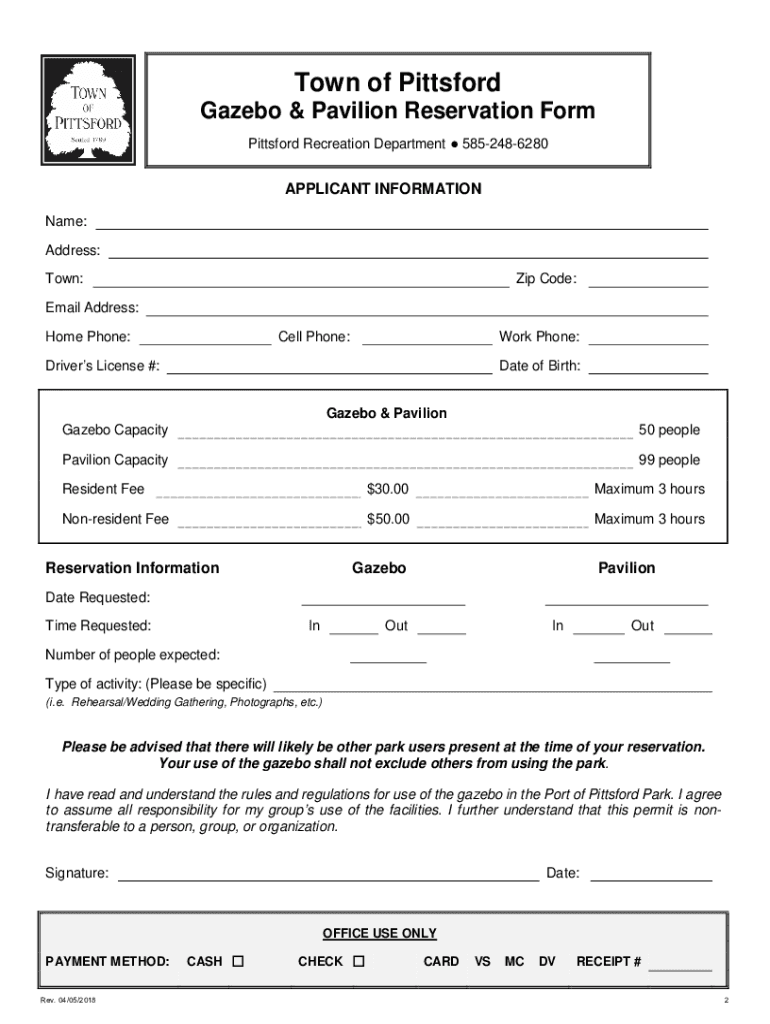 Town of Pitts ford Gazebo & Pavilion Reservation Form Pitts ford Recreation Department 5852486280TIME Gazebo/Pavilion reservations may include any three (3) hour portion of the day between 10:00 am