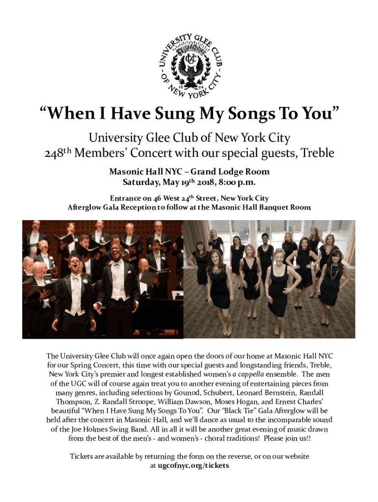 When I Have Sung My Songs To You University Glee Club of New York City 248th Members Concert with our special guests, Treble Masonic Hall NYC Grand Lodge Room Saturday, May 19th 2018, 8:00 p.m. Entrance