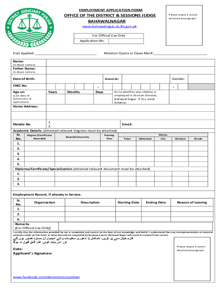 EMPLOYMENT APPLICATION FORM Please staple a recent attested photographOFFICE OF THE DISTRICT & SESSIONS JUDGE BAHAWALNAGAR www.bahawalnagar.dc.lhc.gov.pk For Official Use Only Application No. Post