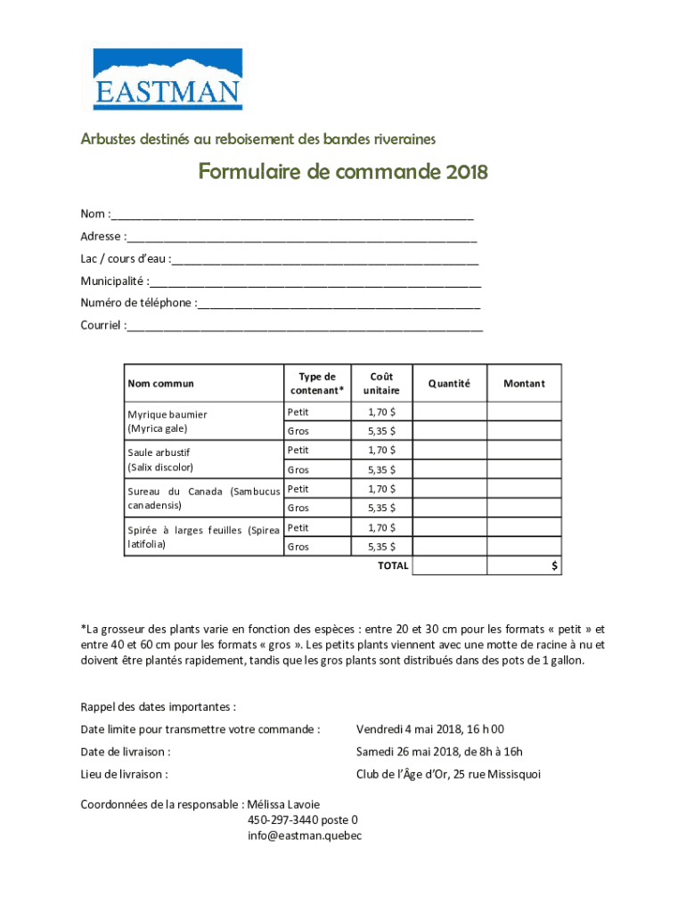 Abuses destiny AU retirement DES bands riverainesFormulaire de command 2018 Not : Address : Lac / course deal : Municipality : Humor DE phone : Courier : Not community de contenant×Cot unitaireMyrique