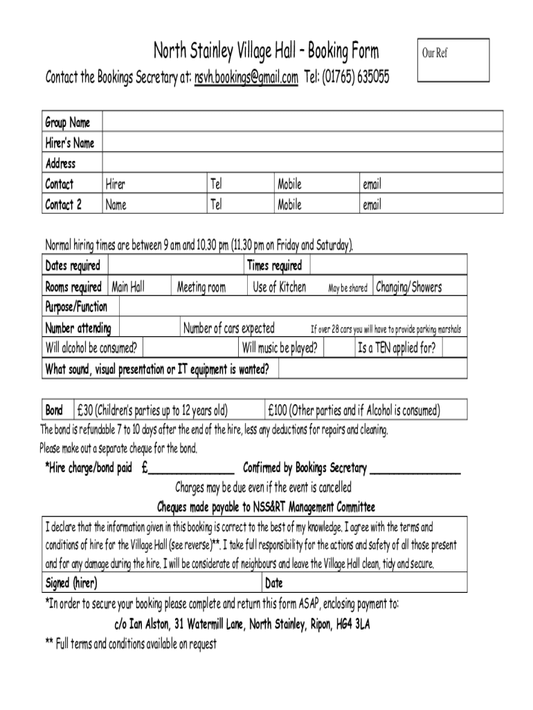 North Stanley Village Hall Booking Former Recontact the Bookings Secretary at: Navy. Bookings gmail.com Tel: (01765) 635055 Group Name Hikers Name Address Contact 2Hirer Gamete Tel Mobile email Normal