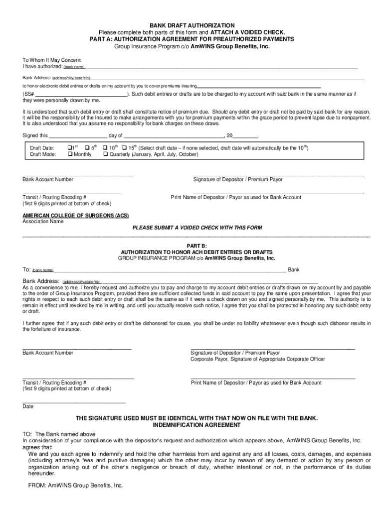 BANK DRAFT AUTHORIZATION Please complete both parts of this form and ATTACH A VOIDED CHECK. PART A: AUTHORIZATION AGREEMENT FOR PREAUTHORIZED PAYMENTS Group Insurance Program c/o Wins Group Benefits,