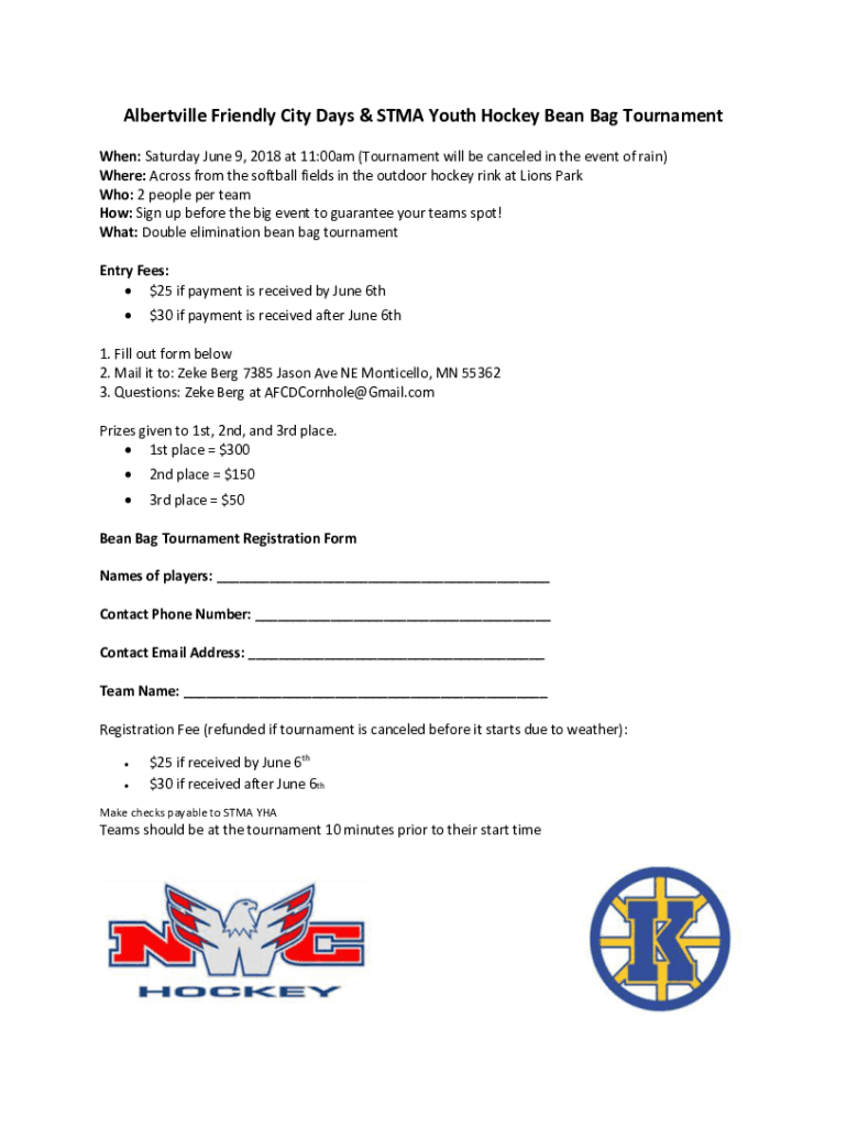 Albertville Friendly City Days & SMA Youth Hockey Bean Bag Tournament When: Saturday, June 9, 2018, at 11:00am (Tournament will be canceled in the event of rain) Where: Across from the softball fields