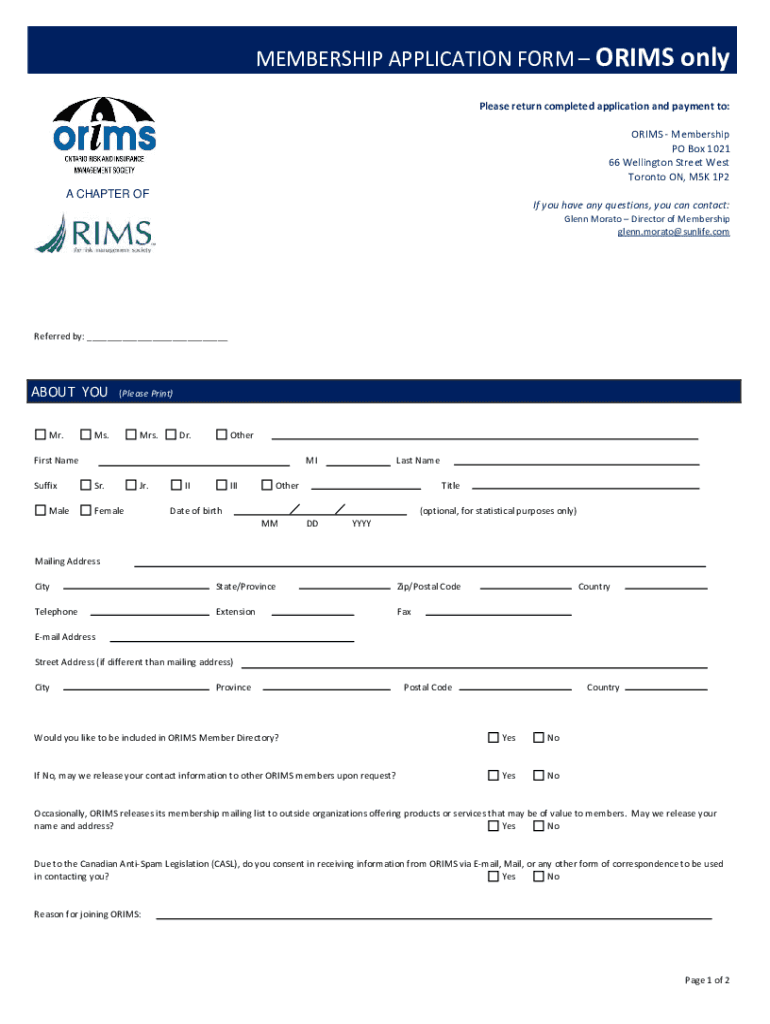 MEMBERSHIP APPLICATION FORM RIMS only Please return completed application and payment to: RIMS Membership PO Box 1021 66 Wellington Street West Toronto ON, M5K 1P2 A CHAPTER Off you have any questions,