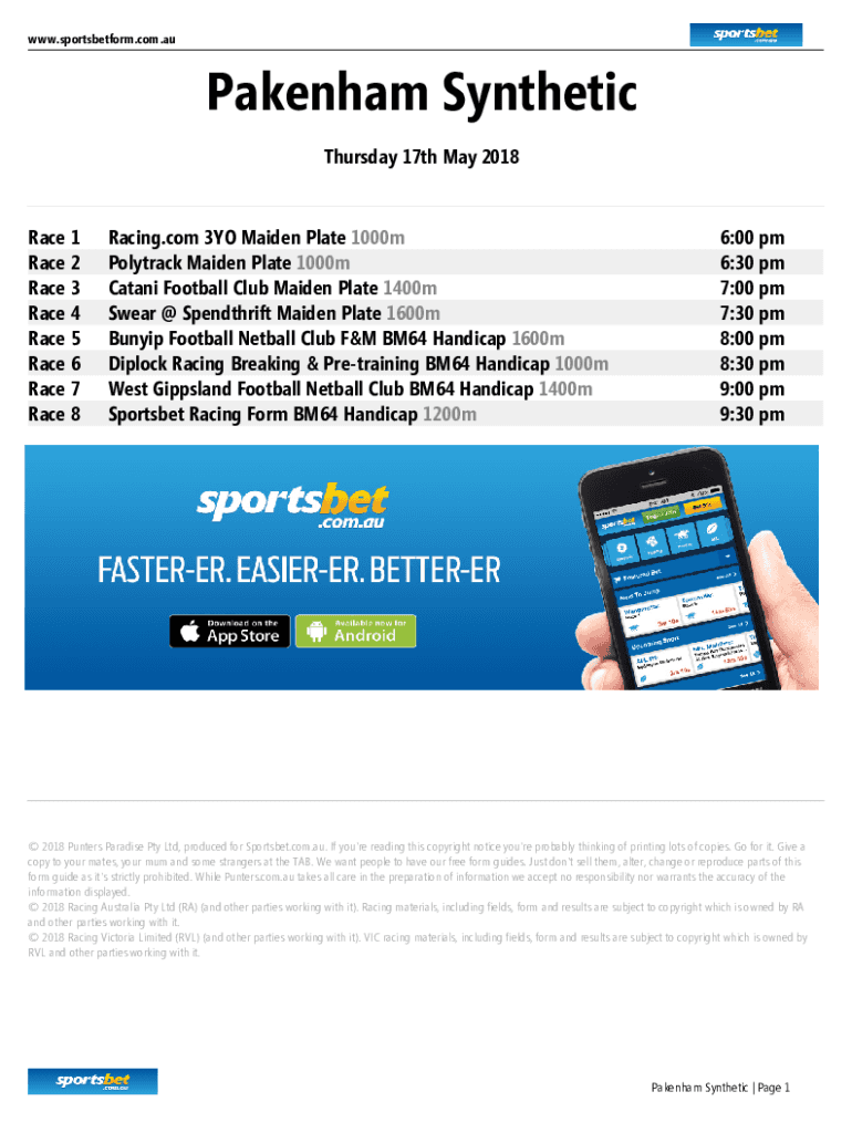 WWW.sportsbetform.com.auPakenham Synthetic Thursday 17th May 2018Race 1 Race 2 Race 3 Race 4 Race 5 Race 6 Race 7 Race 8Racing.com 3YO Maiden Plate 1000 m Poly track Maiden Plate 1000 m Catania