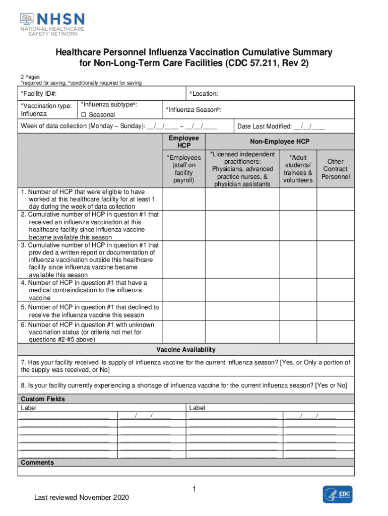 Healthcare Personnel Influenza Vaccination Cumulative Summary for NonLongTerm Care Facilities (CDC 57.211, Rev 2) 2 Pages *required for saving, conditionally required for saving×Facility ID#: *Vaccination
