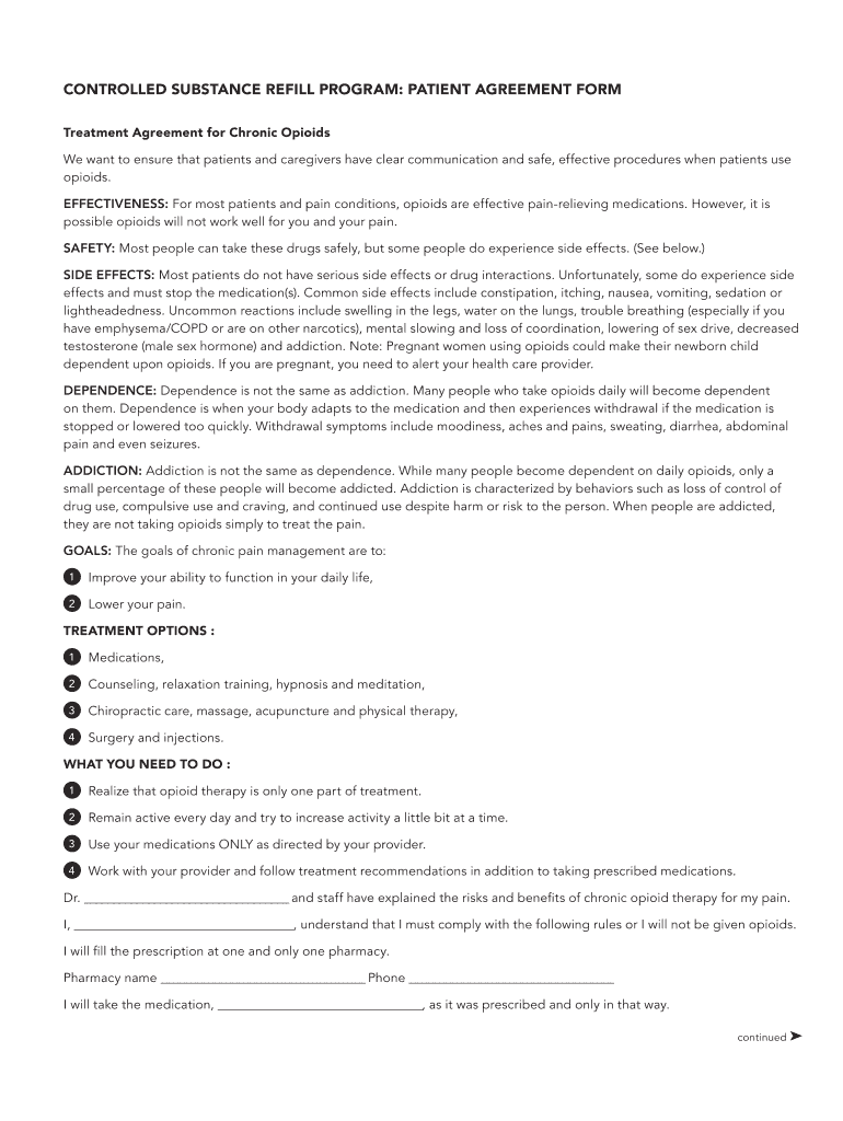 The Controlled Substance Refill Program Patient Agreement Form is a healthcare document used by patients and providers to outline terms for chronic opioid therapy.
