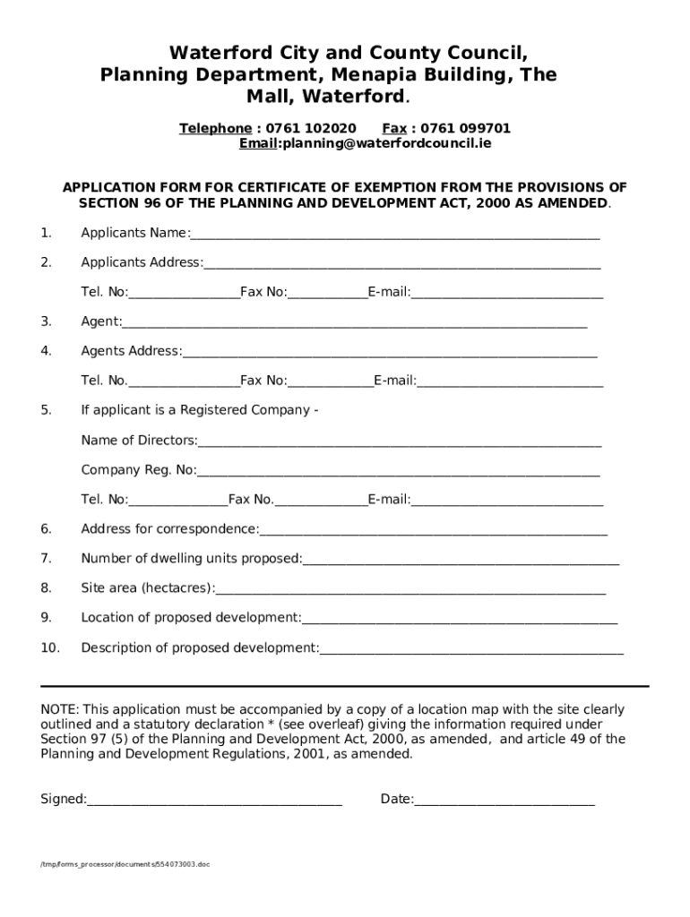 What is APPLICATION FOR CERTIFICATE OF EXEMPTION FROM THE PROVISIONS OF SECTION 96 OF THE PLANNING AND DEVELOPMENT ACT, 2000 AS AMENDED Form?