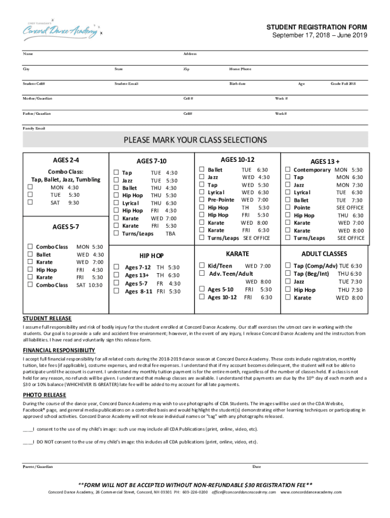 STUDENT REGISTRATION FORM September 17, 2018, June 2019 NameAddressCityStateZipStudent Cell#Student Mailbomb PhoneBirth dateAgeMother/GuardianCell #Work #Father/GuardianCell#Work#Grade Fall 2018Family