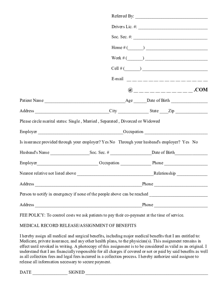 Referred By: Drivers LIC. #: Soc. Sec. #: Home # () Work # () Cell # () Email .COM Patient Name Age Date of Birth Address City State Zip Please circle marital status: Single, Married, Separated, Divorced