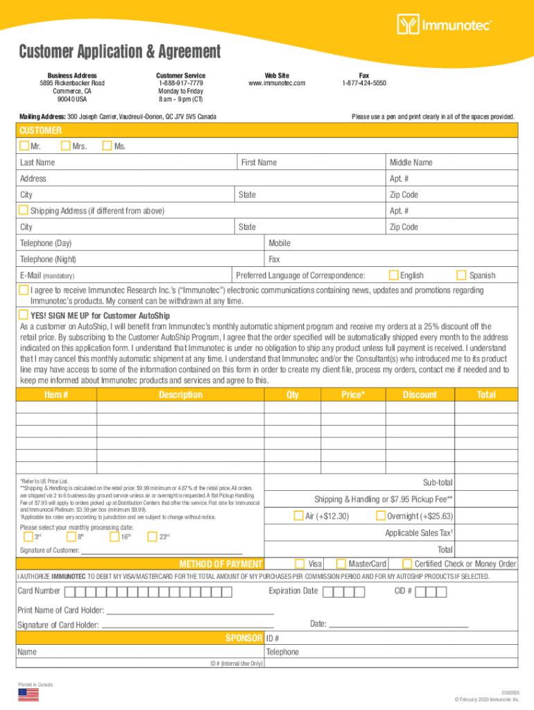 Customer Application & Agreement Business Address 5895 Rickenbacker Road Commerce, CA 90040 Customer Service 18889177779 Monday to Friday 8 am 9 pm (CT)Website www.immunotec.comFax 18774245050Mailing