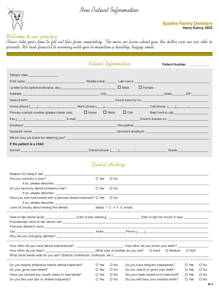 New Patient Information Sparkle Family Dentistry Harry Karma, Welcome to our practice. Please take your time to fill out this form completely. The more we learn about you, the better care we are able