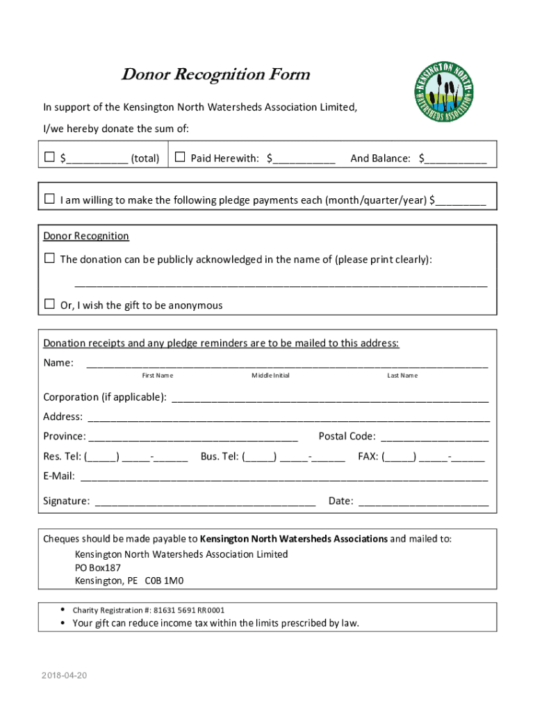 Donor Recognition Form In support of the Kensington North Watersheds Association Limited, I/we hereby donate the sum of: $ (total) Paid Herewith:$ And Balance: $ I am willing to make the following