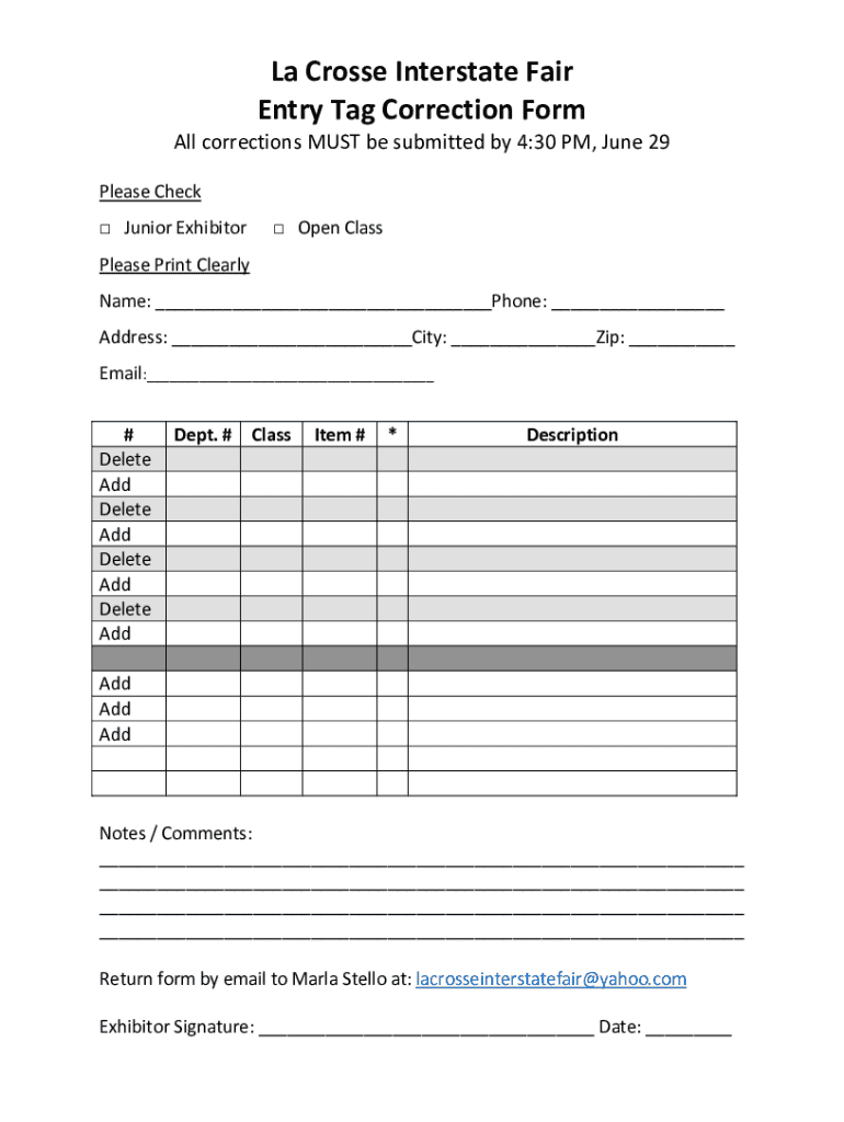 La Crosse Interstate Fair Entry Tag Correction Form All corrections MUST be submitted by 4:30 PM, June 29 Please Check Junior Exhibitor Open Classless Print Clearly Name: Phone: Address: City: Zip: