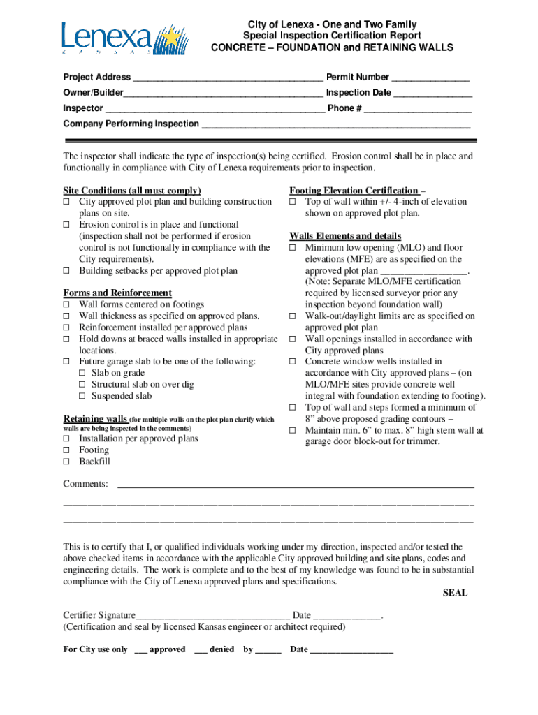 City of Lenexa One and Two Family Special Inspection Certification Report CONCRETE FOUNDATION and RETAINING WALLS Project Address Permit Number Owner/Builder Inspection Date Inspector Phone # Company