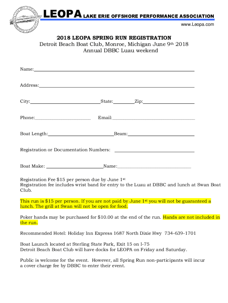 LEONA LAKE ERIE OFFSHORE PERFORMANCE ASSOCIATION www.Leopa.com2018 LEONA SPRING RUN REGISTRATION Detroit Beach Boat Club, Monroe, Michigan June 9th 2018 Annual BBC Luau weekend Name: Address: City: