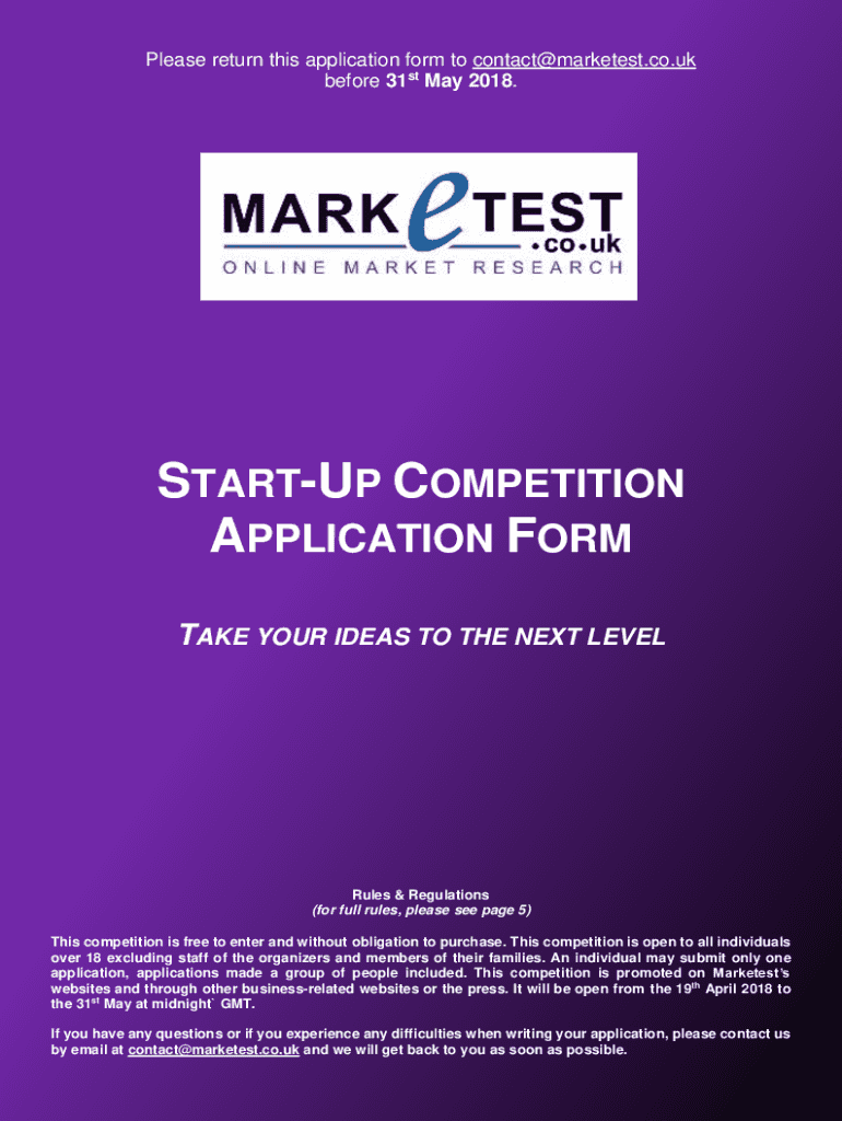 Please return this application form to contact market est.co.UK before 31st May 2018.STARTUP COMPETITION APPLICATION FORM TAKE YOUR IDEAS TO THE NEXT Leverages & Regulations (for full rules, please