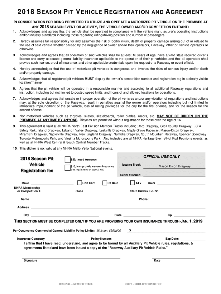 2018 SEASON PIT VEHICLE REGISTRATION AND AGREEMENT